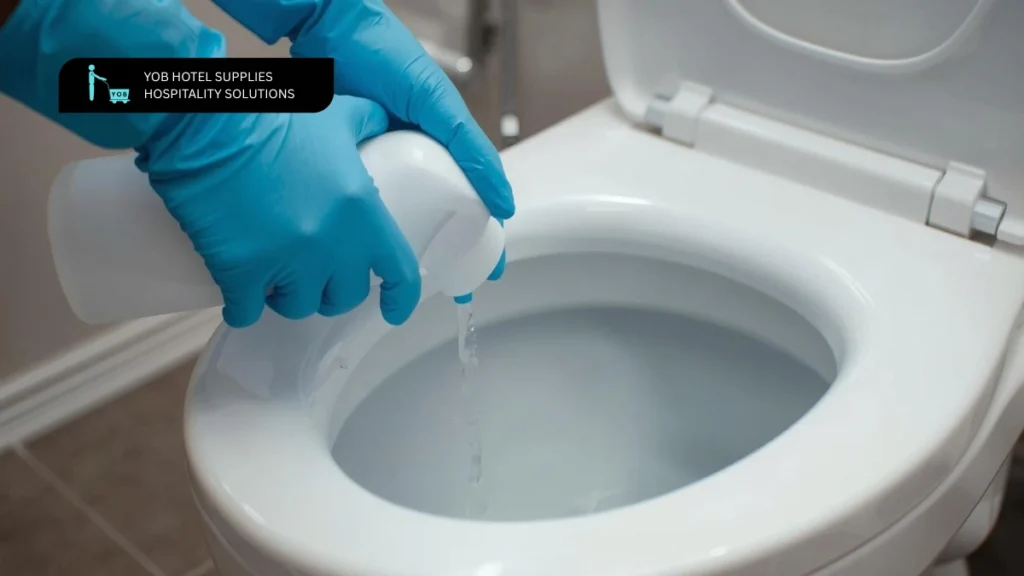 Ensure hygiene in guest bathrooms using our toilet bowl cleaner, a vital item in hotel cleaning products for housekeeping.